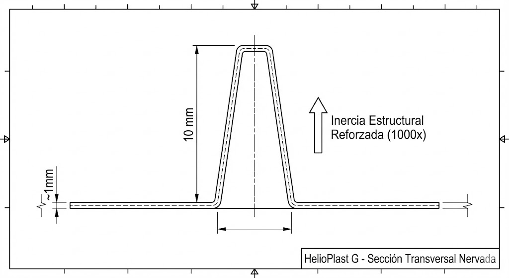 "Gracias a su geometría nervada de alta profundidad de 10 mm, la Geocelda HelioPlast multiplica por 1.000 el Momento de Inercia ( I) de la pared en comparación con una geocelda plana convencional.